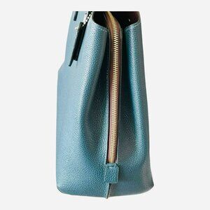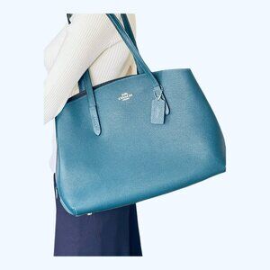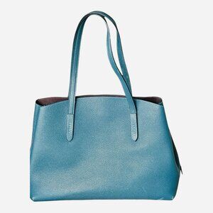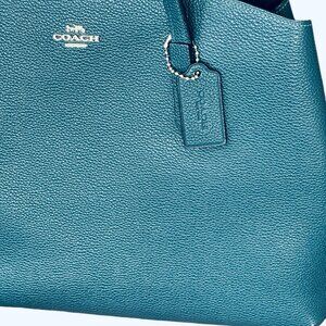 Versatile dark TEAL pebbled leather Shoulder bag, Satchel, Carry-all, Purse. Professional Personal Use Combo. Includes original dust cover, original box, original Measurements Height 12" + Handles 9" Width 15 1/2" Depth 6" Professional or personal use. Zippers are bright gold tone. Four gold tone studs on bottom to protect leather. Has three deep pockets. Zipped center pocket. Two side pockets inside for phone, devices. Original Coach dust cover and box.