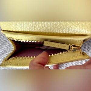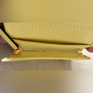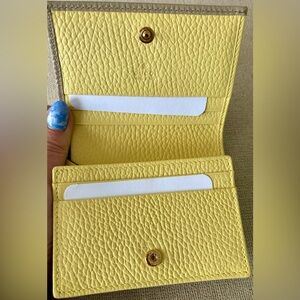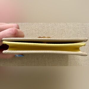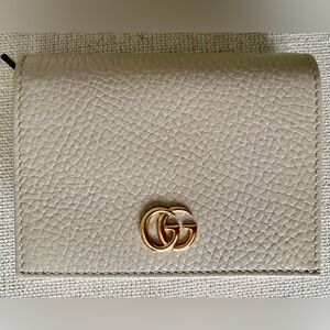 Never used Gucci GG Marmont Card Case wallet. Oatmeal colored leather with soft yellow leather interior.