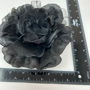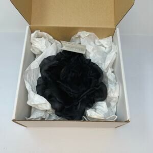 It features a beautiful black silk flower design and comes in its original box.