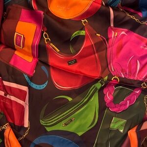 This never-used Kate Spade scarf is in bright colors and features different Kate Spade purses. It is very silky and would accentuate any outfit.