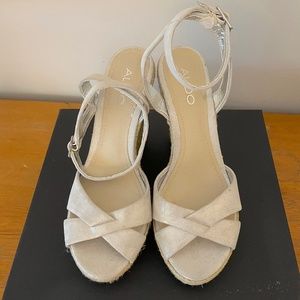 Aldo Champagne shimmer nubuck/suede espadrilles -- never worn! Great timeless espadrille with real suede upper that's totally ON TREND in a great neutral with just a hint of champagne shimmer to give them that little "extra". The 4 3/4" high wedge has a 1' tapered platform under the ball of the foot, so they give you great height while being super comfy and not feeling like a high heel I bought these from Aldo several years ago and never wore them (the original paper/tape holding one of the shoe straps in place is even still on one of the shoes) however the I stored them in a closet full of shoes without their box, so while they've never been worn and are in new condition, if you look very closely, you may see the slightest signs of wear from not being stored in their box.