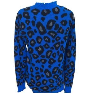 Never worn - super chic cashmere cobalt blue crew neck with animal print pattern and distressed edges. Super soft!