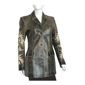 Roberto Cavalli Italian distressed brown and cream leather jacket with two-toned "hand-tooled" leather sleeves. Wearable work of art. Sculpted fit but not tight. Italian S. USA size 6/8. When buttoned, bust 16"-21" Bra size A/B/C Cup. Shoulders 15 1/2"-17" Length 32" Sleeves 25" Pristine!