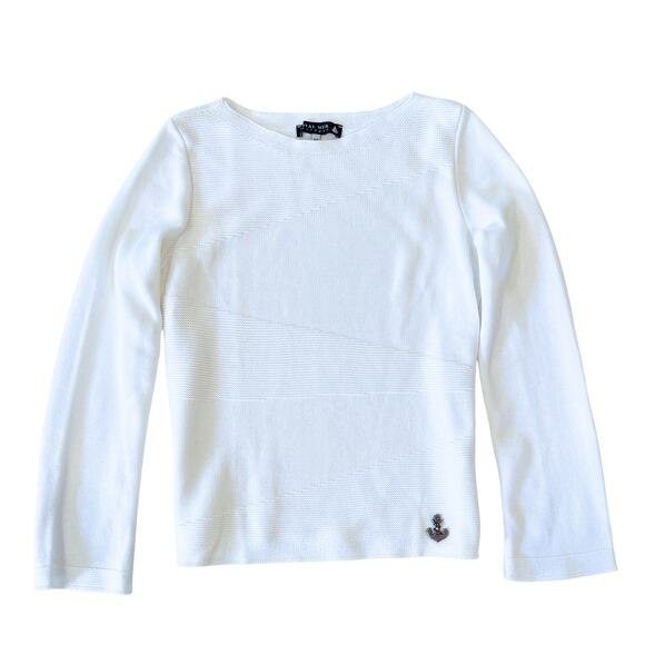 Never worn. Refined French nautical knit by Royal Mer Bretagne is crafted in France from a soft cotton blend with subtle diagonal rib paneling. Crisp white pullover features a gently fitted silhouette, crew neckline, and long sleeves, finished with Royal Mer’s signature metal anchor emblem at the hem and engraved back plate. Texture and detailing reflect the brand’s maritime heritage and commitment to timeless craftsmanship.