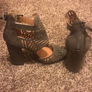dark grayish/ greenish, tribal print chunky heels with adjustable strap and zipper.