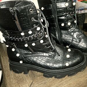 Never Worn,Black Combat Boots w/ Pearl,Chain Details, Side Zipper,Front Lace Up