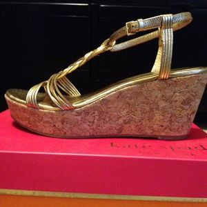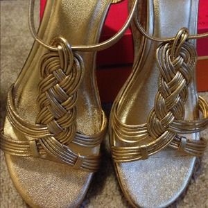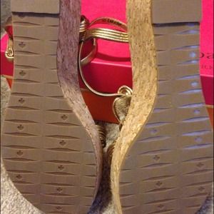 T-strap metallic gold wedge. NEVER been worn. 3" light cork wedge heel, 1.25 front platform, leather lining.