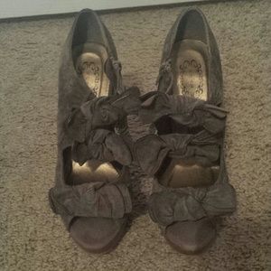 Grey with 3 bows on the front. Zipper on the side. 5 inch heel.