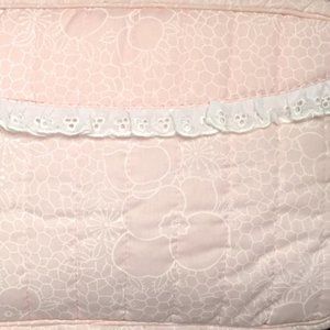 Pretty white-on-pink floral quilted design with eyelet lace trim.