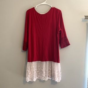 Red long sleeve with red lace at the end of the sleeves and white lace around the bottom