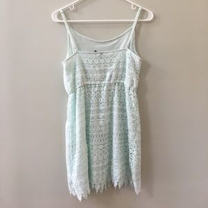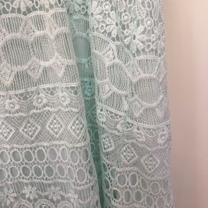 This dress is so cute! It's a very pale, light blue-green, but more on the blue side. Never worn! I love the lace on this dress! The bottom is lined but is still a little sheer so a slip may be needed. Straps are adjustable.