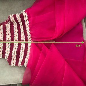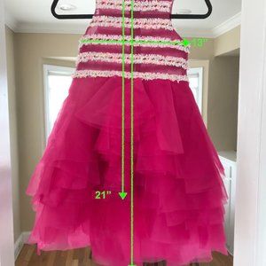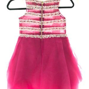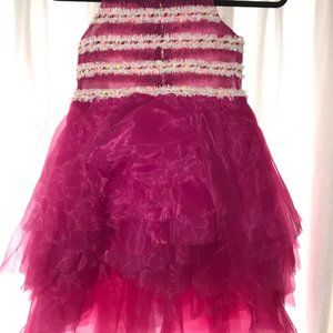Never worn fuschia dress by girls' couture label MISCHKA AOKI. Sleeveless style, with tweed and fringe stripe detailing on the bodice. Exposed gold zip fastening along the back. Finished with an exquisite high-low tulle skirt. For a polished, sophisticated look.