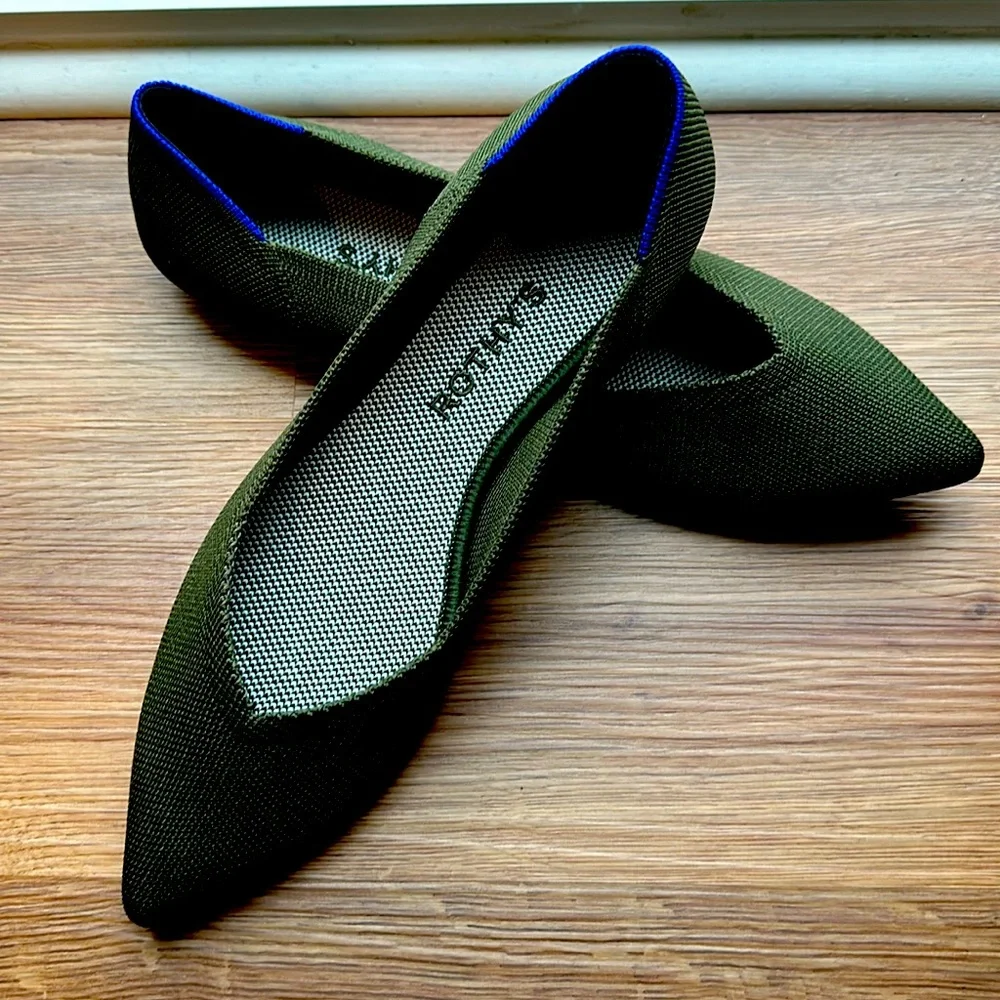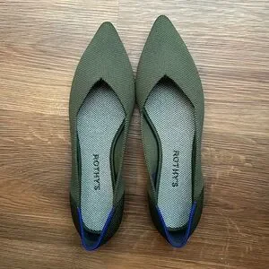 The Point I style Rothy’s in a rich green “Cypress.” This is a pointed style flat. Size up I would recommend size 8. Or 7.5 feet to inquire.