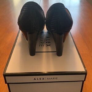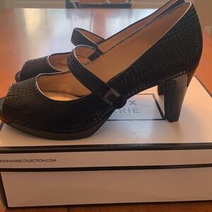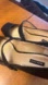 Never worn heel in black. I got them from Dillard’s and they are super cute. Also note the pics of the inside that is peeling away. I took pics of each shoe. I have not worn them. They are 3” heels.