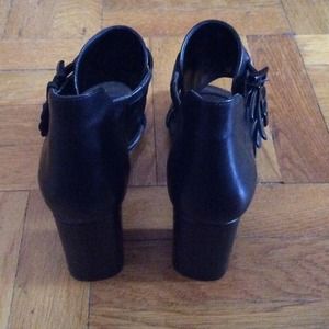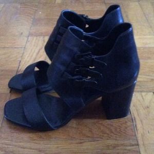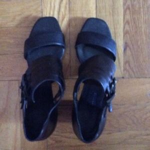 Authentic leather, stacked chunky heel, 3 buckle clasp detail, open toe, cut out ankle shoe!
