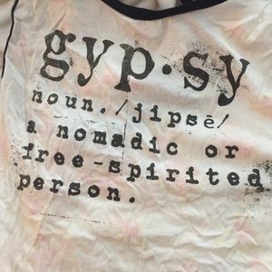 Took tags off, but never worn. Just sat in my drawer because it did not fit over my bust. Size Large. Very cute. Washed out floral print. Comes to mid torso.