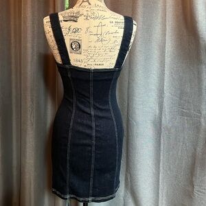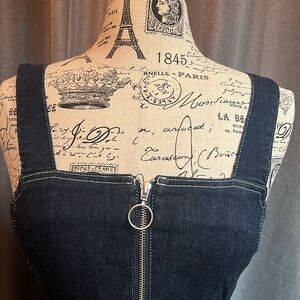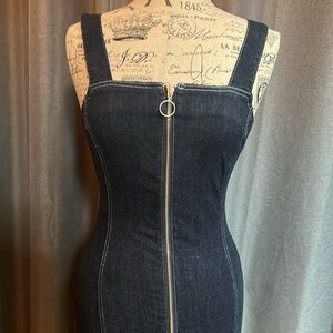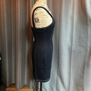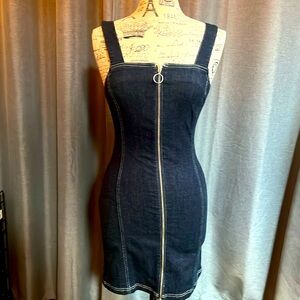 Doesn’t fit and hiding it in the closet. Zip front, square neckline and back. Very stretchy with a good zipper. White seams.
