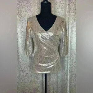 Never worn silver sequined blouse fully lined stretchy with a cross over front and angel sleeves. Pit to pit 16” length 22” sleeves 12”