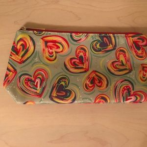 Beautiful new 10 piece bundle cosmetic bag designer set. This lovely set includes cosmetic bags for your essentials from your favorite designers: a gold zippered Lancome cosmetic bag with a full outside zipper and outside compartment, a Clinique mint green heart patterned cosmetic bag with a full outside zipper, an Ulta pink terry zippered cosmetic bag, a Mally Beauty baby pink zippered case, a Victoria’s Secret light rose Terry cosmetic case, a Benefit Cosmetics silver metallic and pink zippered cosmetics case, a Clinique aqua blue and red cosmetic case, a Clinique mint green and purple cosmetics case, a Clinique pink, periwinkle blue and yellow cosmetics case, and a Cleu de Peau metallic zippered cosmetic bag. These gorgeous cosmetic bags are perfect for gifts or for yourself to organize your essentials.