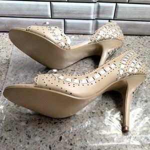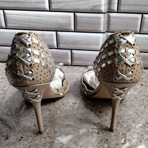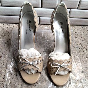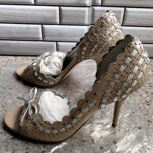New 100% Leather Tan & Silver Leather Scalloped Edge Open Toe Heel