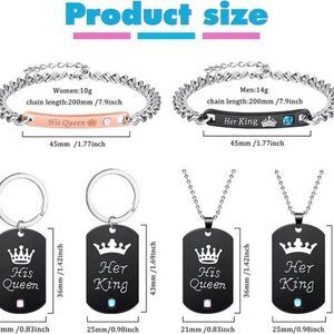 The her king his queen necklace bracelet sets can add more highlights to your whole matching and show the intimacy between you and your lover. The matching keychains are convenient to use and can bring you charms and hold your keys.