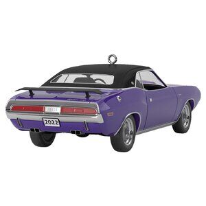 Brand new in box and never opened, hard-to-find premium quality Hallmark Keepsake Christmas ornament only made in 2022, titled "1970 Dodge Challenger R/T-SE" it depicts the classic muscle car in purple & black made of diecast metal with incredible detail including wheels that turn, officially #32 in the Classic American Cars series of ornaments.