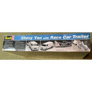 You are buying This 1996 Revell 7250 1/24 Scale Chevy Van with Race Car Trailer Plastic Model Kit that is a must-have for any toy or model enthusiast. The box is really nice in condition and the cellophane is tight! This is not the typical eBay beat up box that you see on here. I kept this just about perfect! The box is big at 18” X 12”. The unassembled kit comes with a white Chevy Van and a trailer that includes a car, perfect for transportation-themed displays or dioramas. The kit is not painted but can be easily customized for those who want to add their personal touch.