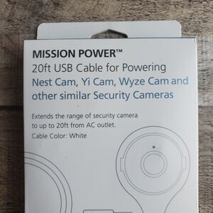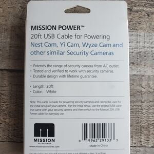 This 20' ft USB Mission Power Electronics Cable in White is compatible with Nest Cam Yi Cam Wyze Cam and similar cameras