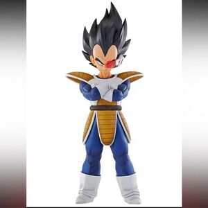 Vegeta action figure with blue and white armor. Features iconic black hair and red scouter.