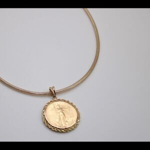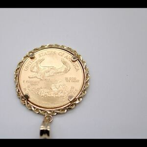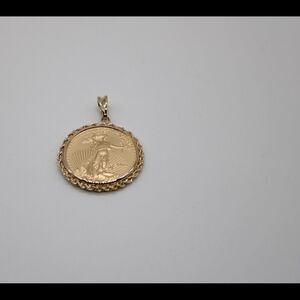 This listing is for a 22k gold 1/2 ounce American Eagle coin mounted in 14k gold four prong bezel. The bezel has a rope design. The total weight is approximately 21.8 grams.