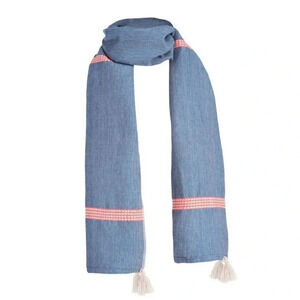 lemlem's 'Tolo' scarf is beautifully hand woven from a blend of merino wool/cotton in a beautiful indigo color with contrasting peach/white patterned stripe. We love the contrasting corner tassels. It has a cozy mid-weight handle and generous drape. Accent yours with Scosha's delicate peach 'carnival' necklace and winter whites as seen here.