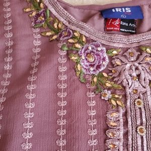 Brand new 3 piece pakistani chiffon outfit. This outfit is in like mauve color and comes with a purple dupatta. This outfit has gorgeous floral thread embroidery and gem stone details with beads on the bottom of the kameez. The backside of the kameez is plain. The pants have a pretty floral patch work on the bottom. The pants material feels like viscose to me. The outfit fabric is delicate threads are pulled from the kameez, and sleeves as seen in the pictures. There is lining attached with kameez the sleeves do not have lining. There is a stain mark and a missing bead, the gems are glued on there may be some gems missing. The dupatta has thread pulled and may have tiny white marks (manufacture errors). All flaws/defects that are mentioned are all manufacture errors. I'm not responsible for any of these flaws.