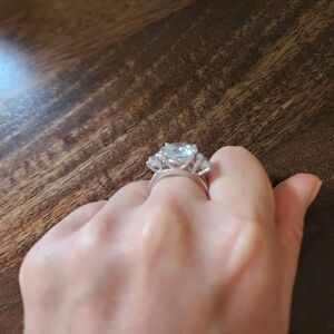 beautiful 3 stone ring- fun cocktail ring or travel engagement ring with 3 sharp clear sparkly CZ stones the center is approx 12.5mm equivalent to a 7 carat diamond! so fun- no wear Shiney new!