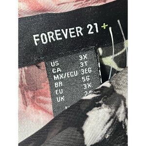 The product is a vintage Y2K sheer top in size 3XL, featuring a whimsical gothic fairy floral design in black. Made from polyester chiffon material, the blouse has an asymmetrical ruffled sleeve and a regular fit, perfect for a grunge, gothic, or fairy style. This top from FOREVER 21 is ideal for women who wear plus sizes and want to add a unique and darkly romantic touch to their wardrobe.