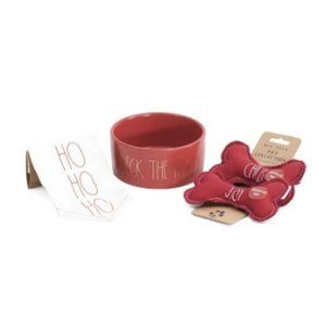 New 4 Pc Rae Dunn "Deck the Paws" 6” Pet Bowl Bandana Dog Toys Red Bowl Gift