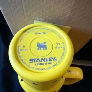 Bright yellow Stanley tumbler with handle. Ideal for daily hydration. Durable and stylish.