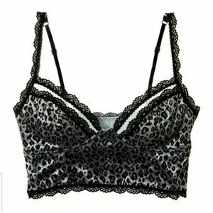 A soft, lace-trimmed bralette, rendered in metallic leopard print. Adjustable straps. Lined.