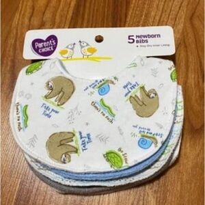 New with tags set of 5 newborn baby bibs. Cute sloth payers.