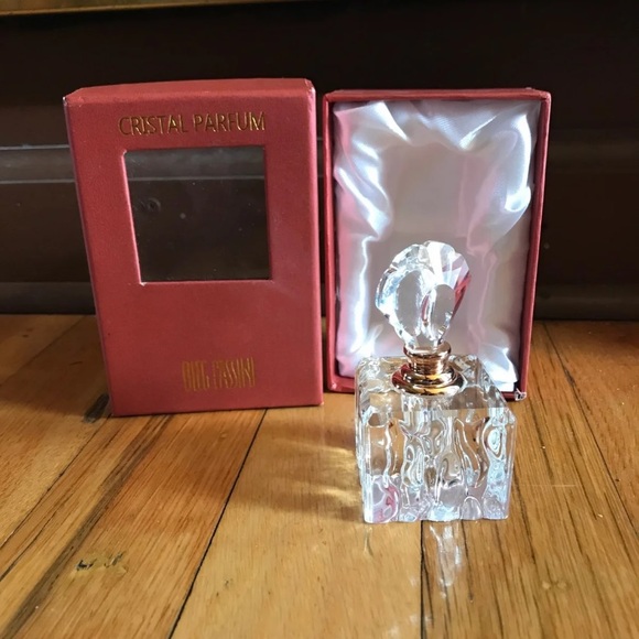 Oleg Cassini crystal perfume bottle, with screw top dispenser.