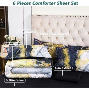 Bed In A Bag: Comforter fabric is made of different AB sides,A side is beautiful marble print,B side is solid color.Flat sheet and fitted sheet are made of same B side fabric,fitted sheet deep pocket design up to 16'' depth,easy to use and cover your mattress perfectly.Enveloping pillowcases with an inside 6" attached hem are designed for pillows to stay in place.Same pattern body pillow cover(pillow are not included)for creating bedroom style to increase the eye-catching point.