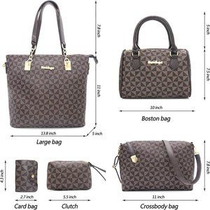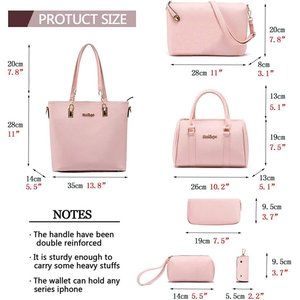 Dimensions of the 2E-youth women handbags set: large tote bag:13.8"L x 4.7"W x 11"H;middle tote bag:10.2"L x 5.1"W x 7.5"H;shoulder bag:11"L x 3.1"W x7.8"H;clutch:5.5"L x 3.7"H;purse:7.5"L x 3.7"H; key holder:2.2"L x 3.7"H.