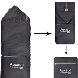up to 65L capacity, except the main compartment, the foldable duffel bag has an individually shoe compartment and 3 zippered pockets (1 inside, 2 outside+shoe compartment). also slot to attach to carryon.