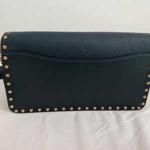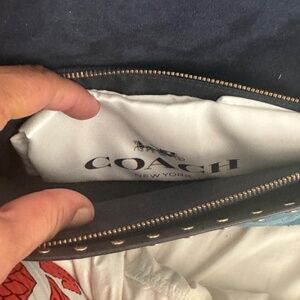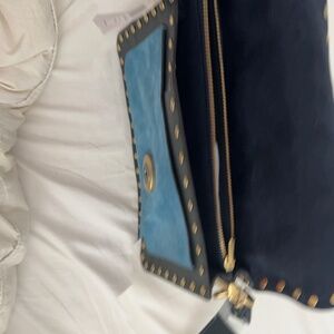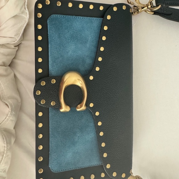NWT blue color block blue leather Coach purse with brass buckle and rivets
