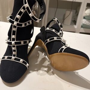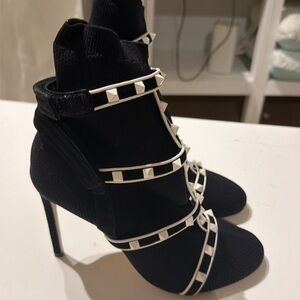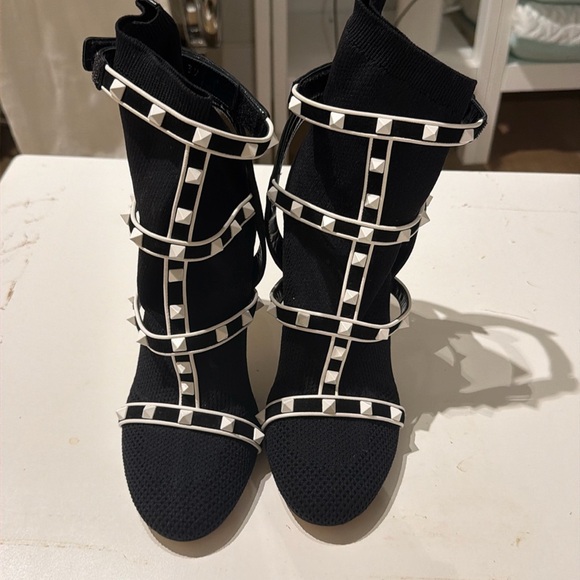 Valentino Garavani Rockstud Bodytech caged knit booties, known for their stretch-knit sock silhouette and lattice straps.