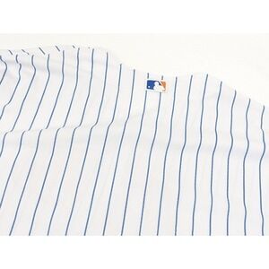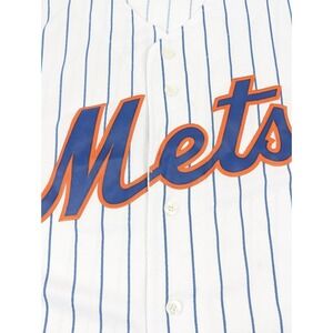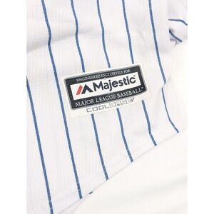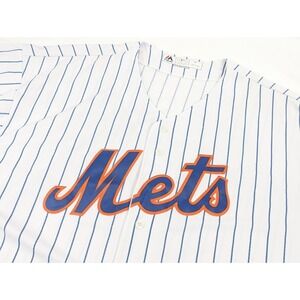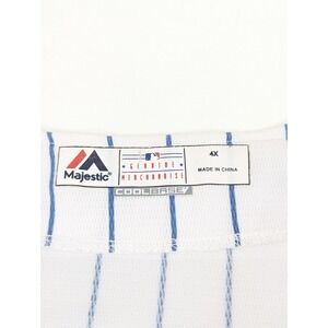 The product is a Men's 4XL Majestic New York Mets jersey in white with blue stripes and orange accents, officially licensed by Major League Baseball. Made in China, this baseball shirt is perfect for fans of the team looking to represent their favorite team during the regular season. Made by a trusted brand like Majestic, this jersey is a high-quality and stylish piece of fan apparel for any baseball enthusiast.