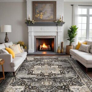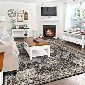 New 8x10 Black Vintage Rug, Washable Stain-Resistant Non-Slip Carpet for Home
