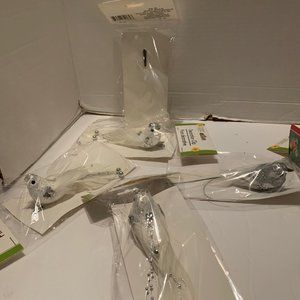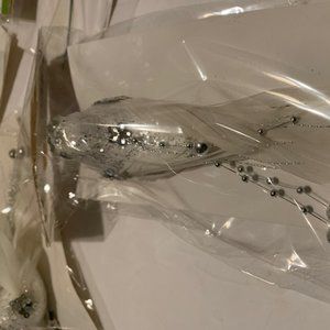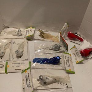 These are new 9 piece Decorative Bird Clips for Weddings and Crafts. There are 5 silver and white birds measuring 5 inches in length, 1.5 inch in width and 2 inches in height. there are 2 red birds, measuring 4 inches in length 1.5 inches width and height. 1 blue same measurement as red and the Gold and Beige measuring same as the white. Beautiful addition to your decorating and craft needs.