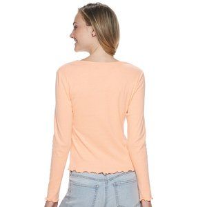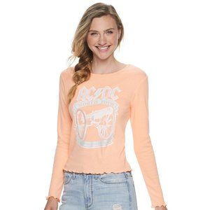 Brand new with tags, officially licensed women's juniors size cropped long sleeved graphic baby tee with a ruffled hem and wrists in neon coral orange ribbed fabric with the AC/DC World Tour image of a cannon and the banner "For Those About to Rock" below all in white and gray and blue.