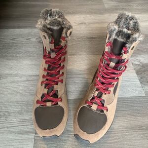 Cozy fur-lined boots with durable design. Stylish red laces for a pop of color. Ideal for winter wear.