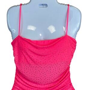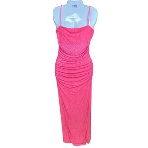 Brand New with Tags AFRM x Revolve Jennan Evening Maxi Long Dress Knockout Pink Rhinestone Ruched BodyCon Slip Dress Adjustable Straps Stretchable Poly/Spandex Mesh Knit Fabric Lined. Color is Hot Pink most like photo of size label MSRP: $118